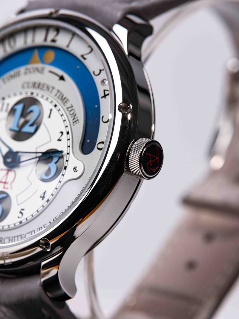 My first glance at the dial made me smile. The layout is unconventional — the “home” time zone sits prominently in a semi-circular arc at the upper half of the dial, with a day/night disc moving beneath. This is not your usual dual time/GMT dial treatment. Rather than a small 24-hour window or a secondary hand, the design privileges that day/night arc and gives character to the whole piece.