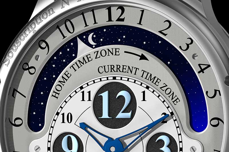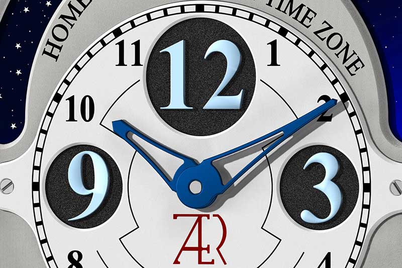 What elevates this watch beyond the base complication is the attention to finish and the little details. For example: the day/night disc under the home time arc isn’t just functional — it’s decorated, with gradual shading from dark (night) to light (day), moon and sun symbols, star-fields in the night section. The dial itself uses hammering and PVD treatment and angled surfaces, giving depth and texture.