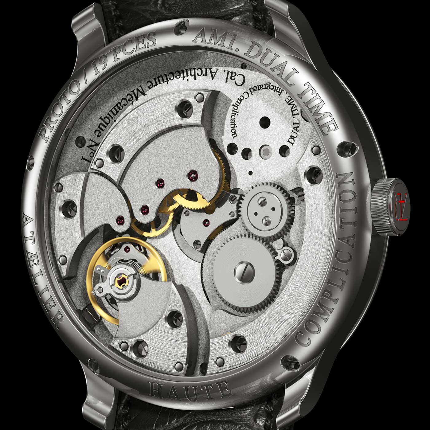 Peering through the exhibition case-back you’ll see the hand-wound calibre called Calibre Architecture Mécanique N°1. Manufactured in German silver (natural, un-plated), it comprises 187 components (movement alone) and uses 28 jewels. It runs at 21,600 vph (3 Hz) and offers between 42-45 hours of power reserve.