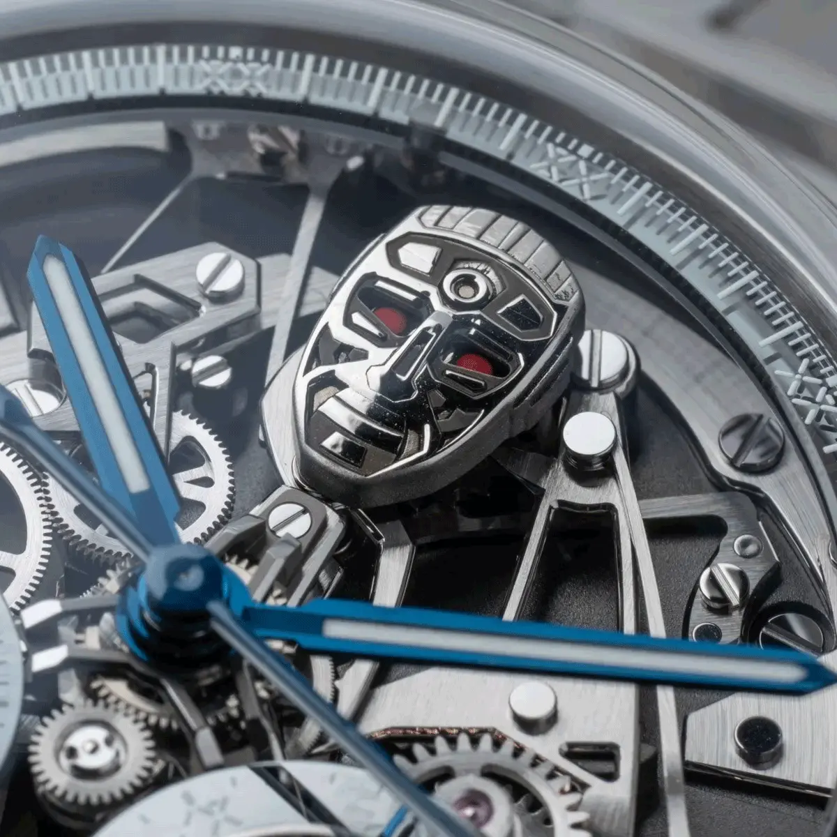 | Dial: | Open-worked, robot-inspired plates with exposed rattrapante mechanism |