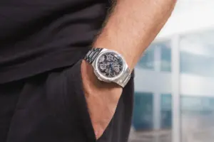 The wide bezel and open dial keep the proportions visually grounded. And the integrated bracelet gives it that unmistakable contemporary luxury presence.
