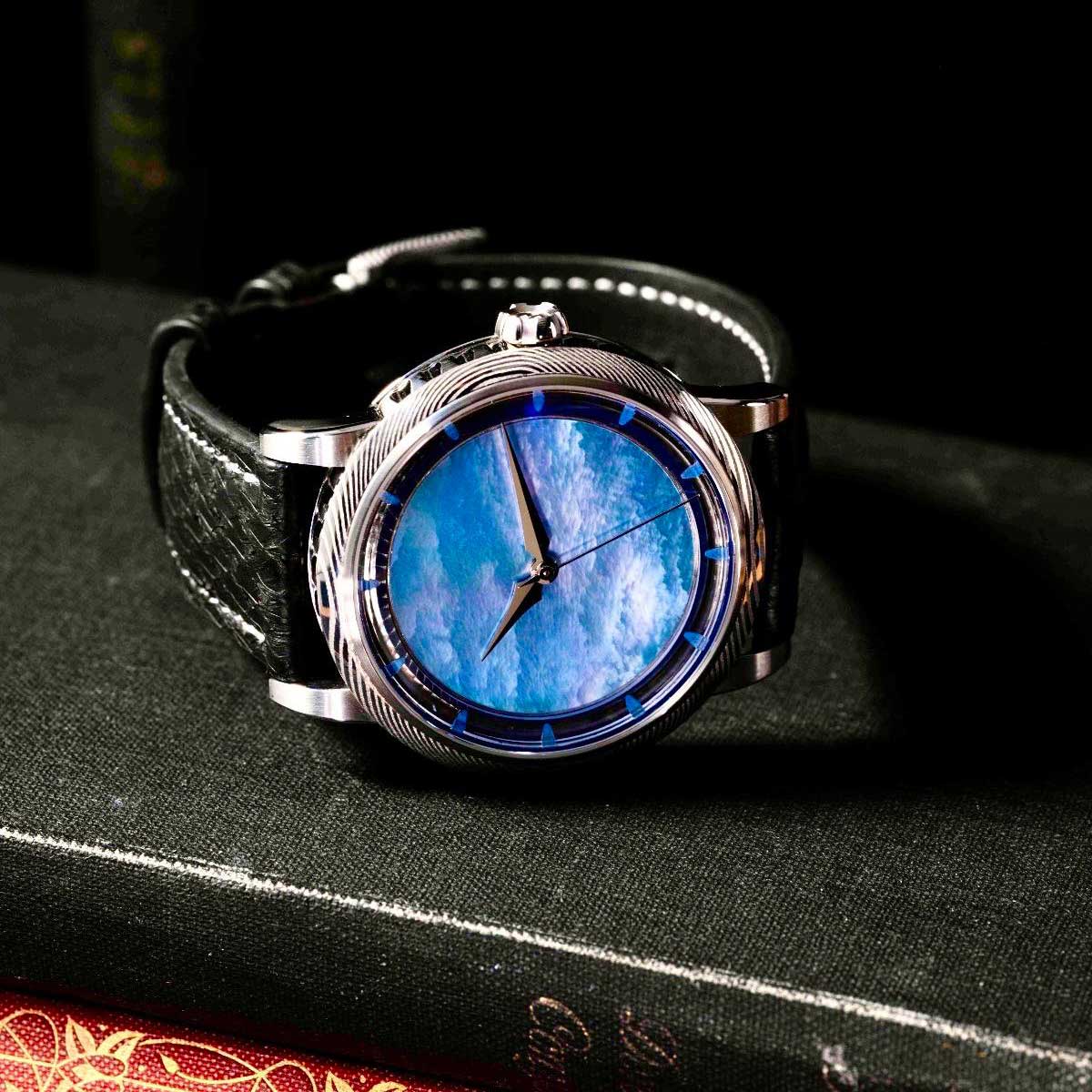 Everything here is touch and texture. The Sky Is The Limit is a masterclass in artisanal finishing — no two dials, cases, or guilloché motifs are ever the same. The Damascus patterning is hand-etched, then thermally colored to achieve a cosmic gradient effect.
