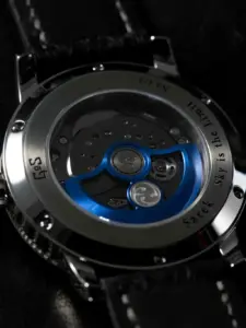 It runs at 28,800 vibrations per hour and provides a 45-hour power reserve — reliable, precise, and in keeping with GoS’s ethos of mechanical honesty and artisanal craft.
