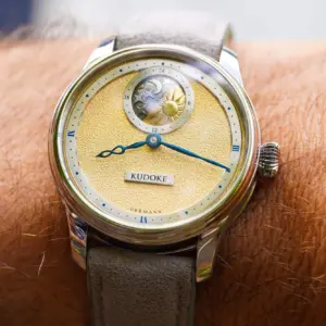 The case is classic Kudoke: round, polished, beautifully proportioned at 39 mm in diameter. This size is important. It is ideal for collectors who miss the days when independent watches were made to be personal objects, not wrist-dominating sculptures.
