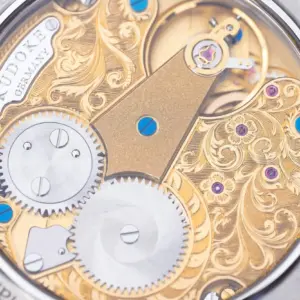 - Hand-engraved balance cock featuring a floral motif inspired by 19th-century Saxon engraving traditions