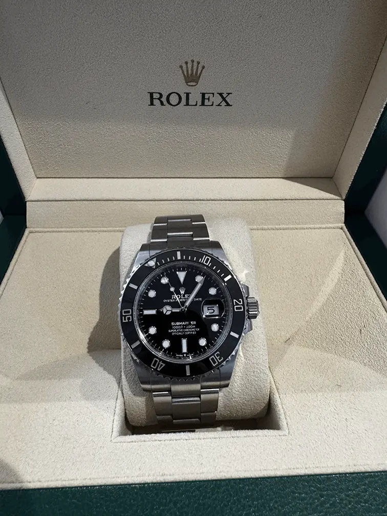 The Submariner 126610LN takes everything iconic about the model and refines it — 41mm Oystersteel case, black Cerachrom bezel, and the unmistakable gloss black dial with Chromalight display.