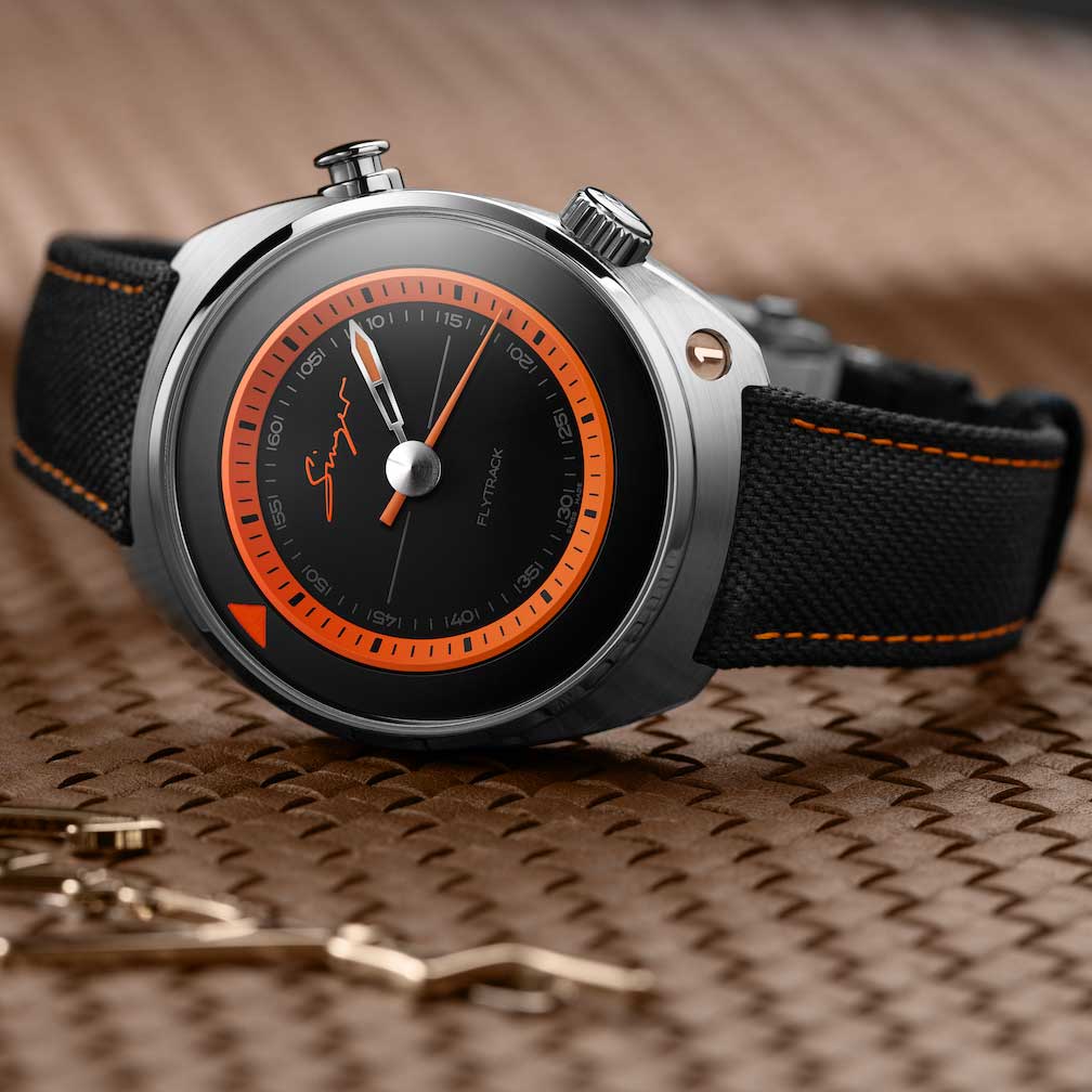 Inside beats the remarkable Singer AGH6363 calibre, a manual-winding movement developed in collaboration with Agenhor, one of the most respected movement specialists in the industry. This calibre is the very heart of the Flytrack concept — a chronograph-like mechanism that allows the central seconds hand to instantly reset, stop, and fly back to zero at the push of a button.