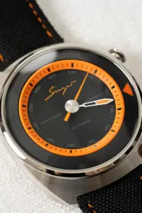 Singer’s attention to detail borders on obsessive — and the On The Road Edition is no exception. The brushed titanium casework, the delicate sandblasted dial texture, and the vibrant orange details all create a tactile harmony.